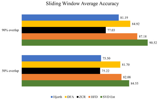 While consistent differences in accuracy across learning techniques have not been found, the Singular Value Decomposition Entropy technique seems to help to consistently develop predictive models with the highest accuracy, regardless of the underlying machine learning technique. This can also be observed from Figure 3 where the average accuracy of each sliding window is presented, grouped across the feature extraction measures. The same thing cannot be said for the other feature extraction techniques, which demonstrated no consistency across machine learning models and data overlapping strategies.