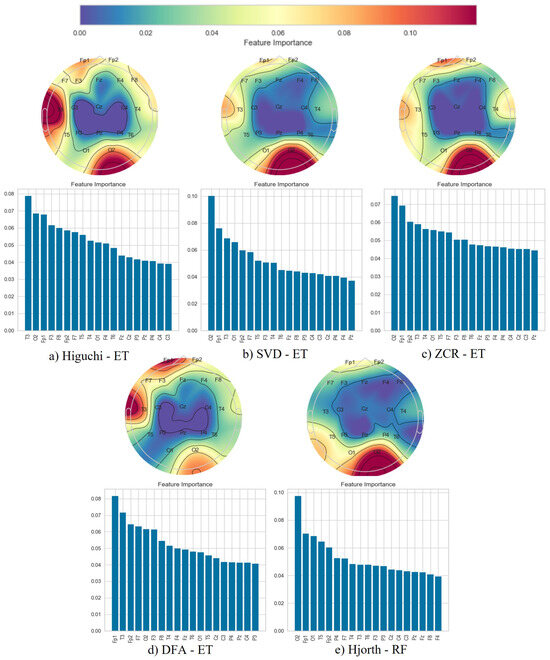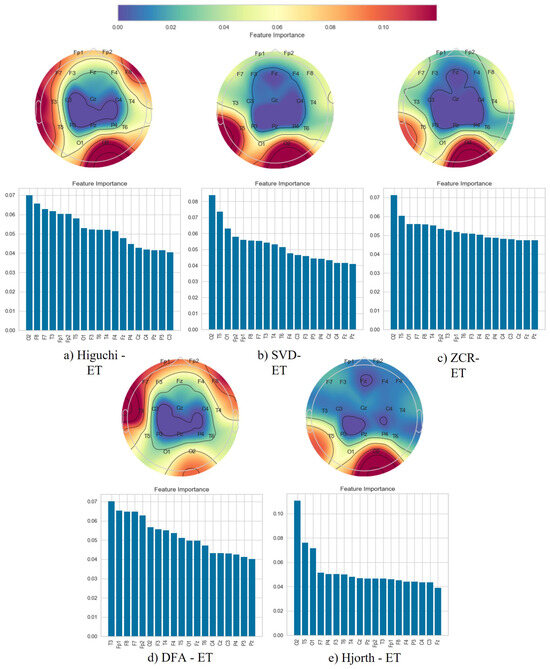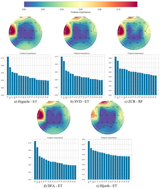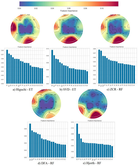 Following the classification phase, we employed a topographical brain mapping technique to improve the interpretability of our predictive models. These maps were instrumental in pinpointing the cerebral regions most crucial for distinguishing AD/FTD patients from HC and AD patients from FTD patients (Figure 4, Figure 5, Figure 6, Figure 7, Figure 8 and Figure 9). We selected the classification model with the highest accuracy (90% overlap, SVD entropy, and a tree classifier) and computed a feature importance array for each feature extraction technique, as detailed in Section 3.3. This array delineated the significance of features derived from each EEG channel in accurately predicting disease. Subsequently, we visualised these feature importance scores on topographic brain maps, illuminating the brain areas with elevated significance in the classification process. The primary objective of this analytical step was to derive deeper insights into the specific brain regions that are most influential in the differentiation between AD/FTD patients and healthy controls, thereby enhancing our understanding of the neurophysiological underpinnings of Alzheimer’s disease and frontotemporal dementia. This approach not only aids in validating the predictive models but also contributes to the broader field of neuroscientific research by identifying potential biomarkers and neuroanatomical correlates of these neurodegenerative diseases.