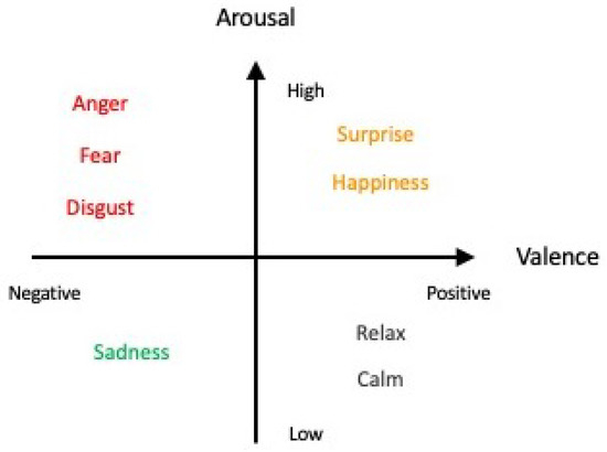 For several decades, studies and findings pertaining to emotions have garnered the interest of many. The most recent WHO statistics reported that in 2019, 970 million people globally suffered from an emotion-related mental disorder, especially for anxiety and depression, which exhibited a 26% and 28% increase within a year, respectively [6]. Acknowledging the importance of studying and detecting emotions, a pioneering group of researchers began the field of work by categorizing emotions into six fundamental classes: happiness, sadness, anger, disgust, surprise, and fear [7,8,9], which can be distributed along the scales of valence and arousal values [10,11,12,13] as depicted in Figure 1 (the six fundamental classes are denoted in colored font). Apart from the Circumplex model, other models such as the Pleasure–Arousal–Dominance (PAD) model and the Five Factor Model (FFM) exist as well for emotion classification [14]. However, the use of other models, such as the PAD model, with the inclusion of a third dimension, “Dominance”, has been deemed to be more suitable for studying nonverbal cues and communication as commonly seen in body language in the field of psychology instead [15]—which lies outside the scope of our review article. The use of the Circumplex model in this article is neither (1) proclaiming that it is the model superior to other existing models for the description of emotions nor (2) demonstrating that it is the only model able to provide an exhaustive description of all known emotions. The sole purpose of the Circumplex model is merely as a simple classification of the six fundamental emotion classes that is aligned with the purpose and scope of our review.