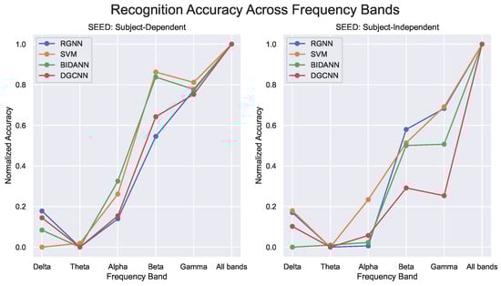 Of note, some recent works have proposed using a spatiotemporal model to capture both the information of different channels (spatially) and at different time stamps (temporally) [23], which will help to ensure that the association of the other brain regions and at different temporal time EEG signals will be learned by the model. Furthermore, in addition to different modeling, the research on EEG-based emotion recognition has undertaken different feature extraction processes on the EEG signals [24,25,26]. In contrast, others have considered specific channels [27] and investigated the frequency bands that contribute more to this recognition process. Furthermore, in considering the significant EEG signal variance among different subjects, a domain adversarial network has been proposed to incorporate into the modeling to improve the recognition by teaching the model how to identify subject-invariant features [28].
