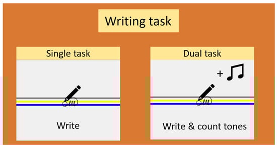 Tasks used to assess learning. The writing task consisted of a three-loop sequence written between target lines, either alone, or in combination with a cognitive dual task. Upon completion of the three loops, participants had to return to the starting point to initiate a new sequence. Writing performance was assessed by amplitude, amplitude variability, deviation from target, and average speed.