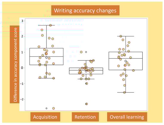 Writing accuracy changes over time. Change in the accuracy component score, which was combined for single and dual tasks, for acquisition, retention, and overall learning shown for each participant (filled circles) and for the whole group (box plots). Means are indicated by unfilled diamonds, and mild outliers by unfilled circles.