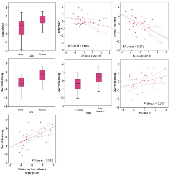 In this study, we investigated the predictive value of clinical measures and resting-state brain functional network organization for motor learning capacity after writing training in PD patients. On a behavioral level, writing accuracy improved after six weeks of training and was maintained after a follow-up period of six weeks without training in the large writing condition, supporting previous work []. In line with our expectations based on previous work [,,], worse baseline writing accuracy was associated with greater learning gains over the short and longer term. After correcting for the influence of baseline writing accuracy, we found female sex to be predictive of better acquisition and shorter disease duration to be predictive of better retention of learning. Moreover, overall gains combining acquisition and retention were positively associated with female sex, absence of FOG, higher unimanual dexterity, and higher sensorimotor network segregation, and negatively associated with motor symptom severity. Importantly, upon combining these predictors in a multivariable model, only baseline accuracy, female sex, and sensorimotor network segregation were predictive of overall learning gains. These findings shed light on the clinical and brain functional determinants of motor skill learning and highlight the complementarity of these indicators to predict motor learning responses in PD.