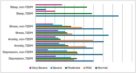 Table 3 and Figure 1 report the rates of concurrent depression, anxiety, and stress symptoms measured among T2DM vs. control subjects. The findings showed that the rates of depression (p = 0.009), anxiety (p = 0.003), stress (p = 0.025), and sleep disorders (p = 0.006) (as scored using the DASS-21 and Pittsburgh Sleep Quality Index (PSQI)), were all higher among T2DM patients vs. controls; vitamin D levels (p = 0.001) were lower among T2DM patients. Thus, 25% of T2DM/COVID-19 patients reported mental health issues as well as sleep disturbances.