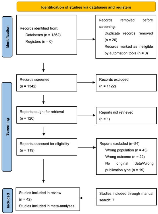 The literature search yielded 1342 citations through electronic databases, which were screened for eligibility; the full text of 119 articles were assessed, and 84 were excluded. Seven additional studies were included through manual search. The final database for the systematic review included 42 studies, of which 31 were also included in the meta-analyses, as can be seen in Figure 1 [71]. Studies included samples from 17 countries in five continents, mainly Europe (k = 24; 57.1%) and North America (k = 14; 33.3%).