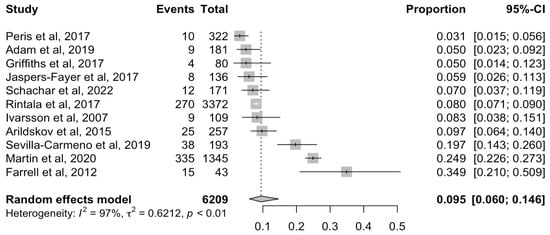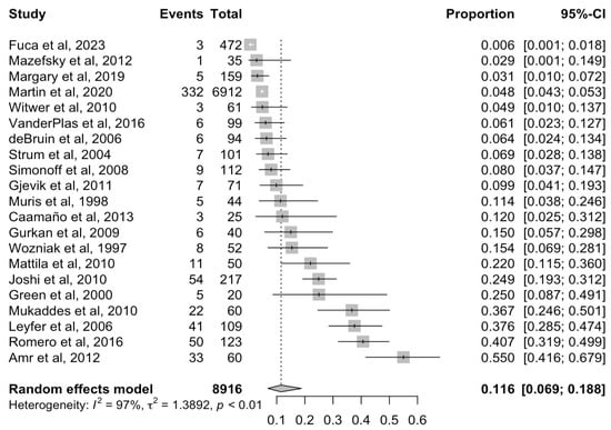 All analyses were conducted within R software, version 1.4.1106, using the metaprop function with the package ‘meta’ [28]. The significance level was set at p < 0.05, two-sided.