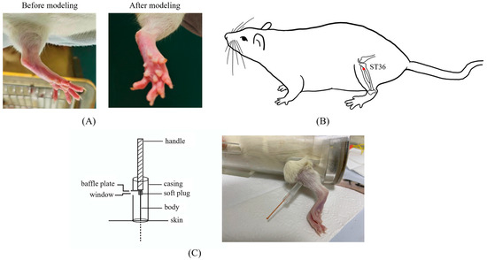 The details of modeling and acupuncture treatment. (A) Swollen left hindfoot metatarsophalangeal joint one day after modeling. (B) Location of the acupuncture point ST36 used in this study. (C) The self-made acupuncture needle cannula used to control the amplitude of the lifting and thrusting manipulations.