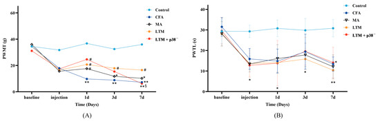 Effects of acupuncture on nociceptive behaviors in the CFA-induced rat arthritic model. (A) PWMT and (B) PWTL were evaluated 24 h before CFA injection (baseline), 1 day after CFA injection (injection), and 1, 3, and 7 days after acupuncture treatment. PWMT, the paw withdrawal mechanical threshold; PWTL, the paw withdrawal thermal latency. * p < 0.05 and ** p < 0.001 compared with the control group; # p < 0.05 compared with the CFA group; § p < 0.05 compared with the LTM group. N = 8 in each group. PWMT, paw withdrawal mechanical threshold; PWTL, paw withdrawal thermal latency; CFA, complete Freund’s adjuvant; MA, minimum acupuncture; LTM, lifting and thrusting manipulations.