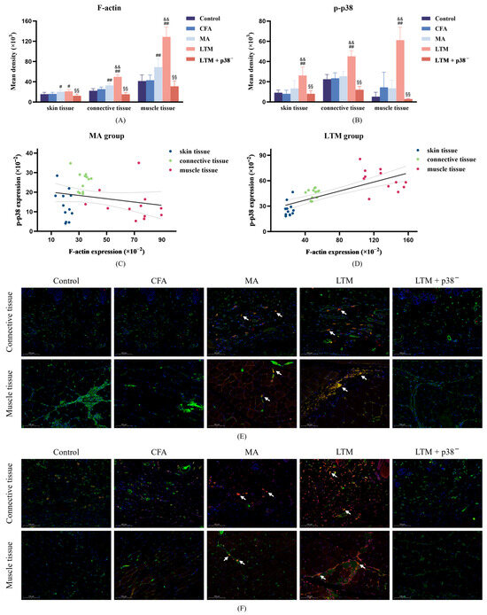 F-actin expression and p-p38 level in fibroblasts of the ST36 acupoint area after a seven-day intervention. (A,B) Fluorescence intensity of F-actin filaments and p-p38 in fibroblasts from skin, connective, and muscle tissues. # p < 0.05 and ## p < 0.001 compared with the CFA group; && p < 0.001 compared with the MA group; §§ p < 0.001 compared with the LTM group. N = 12 in each group. (C,D) The linear correlation between F-actin expression and p-p38 level in the MA and LTM groups. (E,F) Immunofluorescence staining for (E) F-actin and (F) p-p38 (red), Vimentin (a fibroblast marker) (green), and DAPI (blue) in fibroblasts of the acupoint area with different interventions. The orange and yellow zones (indicated by arrows) denote the colocalization of all three elements within the loose subcutaneous connective tissue and intermuscular connective tissue in both the MA and LTM groups. Therefore, fibroblasts expressing F-actin or p-p38 positively are predominantly distributed in these regions. Scale bar, 40×: 100 μm. p-p38, phosphorylated p38 MAPK; CFA, complete Freund’s adjuvant; MA, minimum acupuncture; LTM, lifting and thrusting manipulations.