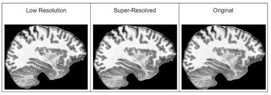 Super-resolution technology has been a helpful tool in many different science areas, for example, hyperspectral imaging [20], nature sciences [21], satellite imagery [22], license plate recognition [23], and medical imaging—this paper. This technology utilizes deep learning models to increase the quality of low-resolution data by upscaling and reconstructing an image, which would be accurate and meaningful. Usually, researchers focus their super-resolution solutions into improvements in a controlled environment, where a small dataset with a highly specialized solution can reach high results, but all of these solutions are impractical in real world scenarios, where data are usually not a controlled factor. A small change in the data domain means the model will be incapable of reconstructing that image. In these challenging scenarios, “real-world” super-resolution solutions become useful. These solutions do not rely on paired image datasets, where a low-resolution image is known for each high-resolution image. Here, low-resolution images are generated randomly by utilizing degradation (augmentation) techniques in a completely random order [24]. By using degradation techniques, we can cover a wider distribution of possible input images, making the model more practical. Therefore, this paper utilizes the real-world super-resolution paradigm. Another problem with super-resolution is that many solutions are not focusing on the perceptual quality of the reconstructed images. Many researchers only focus on peak signal-to-noise ratio (PSNR) and structural similarity index measure (SSIM) to report their results, even though subjectively generated images are blurry and noisy. In the medical imaging field, preserving the structural part of the image quality is as important as the perceptual part. Therefore, just like in our previous paper [25], we maintain the focus to improve the main important aspects of the image quality—structural and perceptual.