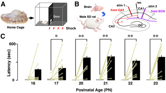 Inhibitory avoidance (IA) task and postnatal development of performance. (A) Schematic illustration of the IA training apparatus. (B) Diagrams illustrate electrode placements for patch-clamp analysis at CA3-CA1 synapses and ECIII-CA1 synapses. (C) Thirty minutes after training, a prolonged latency to enter the dark side of the box was observed from PN 17 to 23. Data are presented as individual data points and expressed as the mean ± SEM. The same rats are connected by yellow lines. * p < 0.05, and ** p < 0.01 vs. before training.