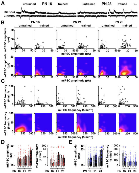 Postnatal development of IA-task-induced synaptic plasticity. (A) Representative traces of miniature excitatory postsynaptic currents (mEPSCs) and miniature inhibitory postsynaptic currents (mIPSCs). We recorded the currents sequentially in the same CA1 pyramidal neuron in the presence of tetrodotoxin (0.5 µM). Vertical bar = 20 pA; horizontal bar = 50 ms. (B) The upper panel displays two-dimensional plots of the mean mEPSC and mIPSC amplitudes in an individual neuron, and the lower panel presents the kernel density visualizing the distribution of the appearance probability at any point. (C) The upper panel displays two-dimensional plots of the mean mEPSC and mIPSC frequencies in an individual neuron, and the lower panel presents the kernel density. (D) Postnatal changes in the mean mEPSC amplitude and frequency in untrained (gray) and trained (black) rats. (E) Postnatal changes in the mean mIPSC amplitude and frequency in untrained (gray) and trained (black) rats. IA training increased the amplitudes of both excitatory (mEPSCs) and inhibitory (mIPSCs) miniature synaptic events at PN 23, but decreased the frequencies of both mEPSCs and mIPSCs at PN 16. The number of neurons in each group is shown at the bottom of each bar. Error bars indicate + SEM. * p < 0.05, ** p < 0.01, *** p < 0.001, **** p < 0.0001 vs. untrained.