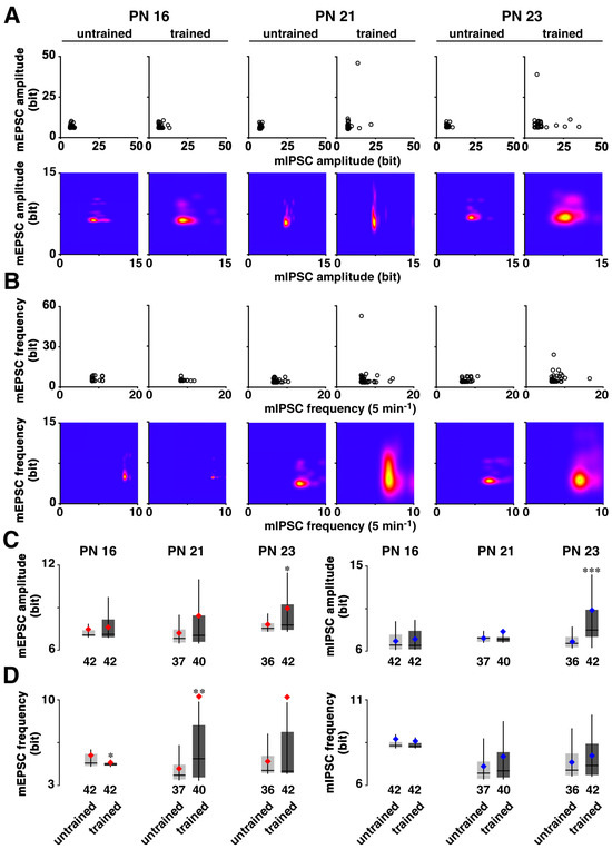 Postnatal development of the gained self-entropy in individual neurons. (A) By calculating the appearance probability of individual dots in mEPSC and mIPSC amplitudes, we calculated the self-entropy (bit) of individual neurons (upper), and visualized the kernel density distribution (lower). (B) The same process as in (A), applied for mEPSC and mIPSC frequencies, showing the self-entropy (upper) and the density distribution (lower). (C) Distribution of self-entropy for mEPSC or mIPSC amplitude in individual neurons in PN 16, PN 21, and PN 23 rats. (D) Distribution of self-entropy for mEPSC or mIPSC frequency in individual neurons in PN 16, PN 21, and PN 23 rats. The box indicates 50% central area with a line that represents the median. The vertical line indicates minimum to maximum data area without outliers. The red/blue dot represents the average. The number of neurons in each group is shown at the bottom of each bar. * p < 0.05, ** p < 0.01, *** p < 0.001 vs. untrained.
