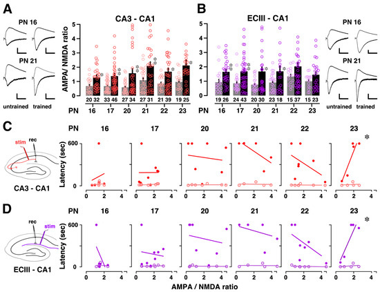 To evaluate training-induced synaptic plasticity specific to CA3-CA1 or ECIII-CA1 synapses, we examined the ratio of AMPA- and NMDA-receptor-mediated currents at these synapses [21]. At CA3-CA1 synapses (Figure 4A), IA training substantially enhanced the AMPA/NMDA ratio at CA3-CA1 synapses during PN 16–23, suggesting the training-induced strengthening at CA3-CA1 synapses. Similarly, at ECIII-CA1 synapses (Figure 4B), IA training substantially increased the ratio at ECIII-CA1 synapses during PN 16–21, suggesting training-induced strengthening at ECIII-CA1 synapses in juvenile rats.