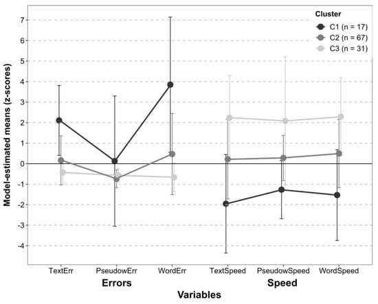 We could test the fit of LPA models with two and three clusters, as with four clusters, we encountered estimation problems. According to the criteria described above, we chose the three-cluster model (AIC = 2264.291, BIC = 2335.659, SBIC = 2253.478, p(BLRT) < 0.001) over the two-cluster model (AIC = 2359.121, BIC = 2411.274, SBIC = 2351.219). Based on children’s profile scores, clusters were labelled as ‘poor readers’ (C1, N = 17), ‘average readers’ (C2, N = 67), and ‘good readers’ (C3, N = 31) (Figure 1). Table 2 shows the estimated means for each variable, their 95% confidence intervals, and the post hoc comparisons between the three clusters of children (Benjamini–Hochberg correction; [116]).