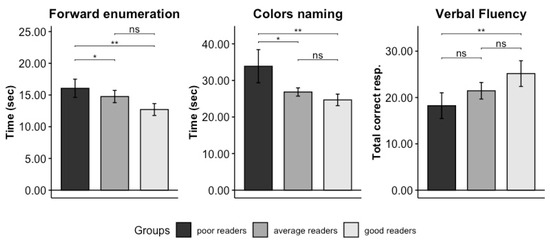Results of the univariate post hoc comparison performed in Domain B. The name of every specific test is indicated at the top of each plot, and the means of each test score—namely time (in seconds) in forward enumeration and color naming and number of correctly recalled elements in verbal fluency—are presented on the Y axis. The significance levels of results are indicated as follows: ‘**’ means p = 0.01, ‘*’ means p = 0.05, and “ns” means non-significant. Poor readers are represented in dark grey, good readers in light grey, and average readers in medium–dark grey. Vertical bars represent standard errors.