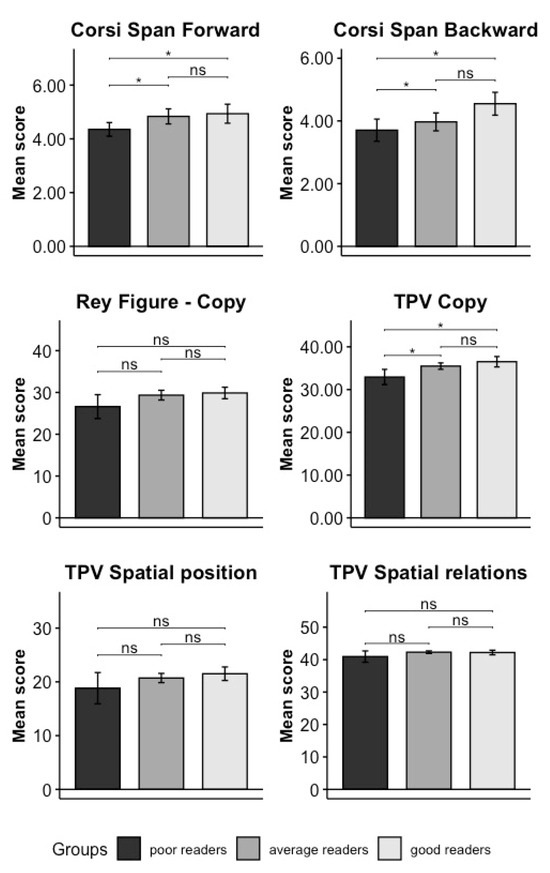 Results of the univariate post hoc comparison performed in Domain C. The name of every specific test is indicated on the top of each plot, and the mean of each test score—namely the number of elements correctly recalled in the forward and backward Corsi test, the mean of the total score in the Rey figure, and the mean of each of the TPV tests—are presented on the Y axis. The significance levels of the results are indicated as follows: ‘*’ means 0.01 < p < 0.05, and “ns” means non-significant (p > 0.05). Poor readers are represented in dark grey, good readers in light grey, and average readers in medium–dark grey. Vertical bars represent standard errors.