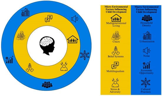 Figure 3. Micro and macro environmental factors that differentially influence child cognitive and brain development. Items highlighted in yellow represent micro-environmental factors that are more proximal to the child’s development, while items highlighted in blue represent macro-environmental factors that are more distal to the child’s development.