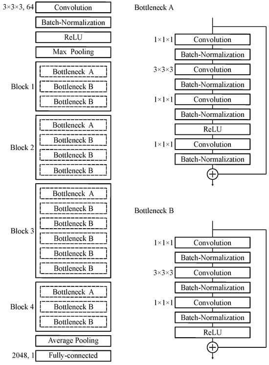 The Centiloid scale was predicted from amyloid PET images using the 50-layer three-dimensional (3D) ResNet architecture (https://github.com/xmuyzz/3D-CNN-PyTorch accessed on 6 December 2023). This deep learning model was modified from the standard 3D ResNet to address the specific complexities of processing PET images for AD. ResNet facilitates effective learning in the deepest models through skip connection. In addition, the ability of 3D CNN to process volumetric data makes it particularly useful for PET data analysis in AD, where it can effectively capture the spatial complexity of local amyloid deposition. It features a comprehensive design that includes 3D convolutional layers for spatial data processing, batch normalization to accelerate training and improve model performance, and rectified linear units (ReLUs) for nonlinear transformations. The architecture also includes a max-pooling layer to reduce dimensionality and improve feature extraction, followed by four sequential layer blocks carefully constructed with bottleneck blocks. These blocks are designed to deepen the network without increasing its complexity or computational load through a combination of 3D convolution, batch normalization, ReLUs, and down sampling layers. This allows the model to learn more complex features from the PET images with greater efficiency. Sequential layer blocks consisting of 3, 4, 6, and 3 bottleneck blocks allow the model to adaptively refine its predictions, making it highly effective for medical imaging tasks. An average-pooling layer follows these blocks, leading to a fully connected layer that culminates the network architecture and facilitates the final prediction of the Centiloid scale. Figure 1 shows the structure of our deep learning model. A network model was implemented on the following system environment: Intel(R) Xenon Gold 5222 3.80 GHz; NVIDIA RTX A6000 video card with 24 GB of video memory; CUDA v. 11.6; PyTorch v. 1.12.1; Python v. 3.8.13; and Ubuntu 18.04 LTS.