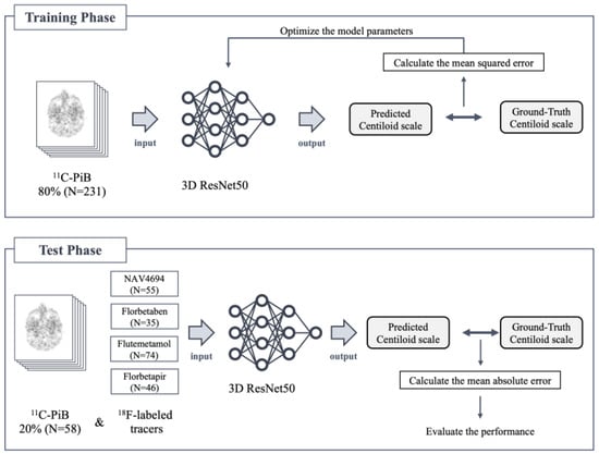 Figure 2 shows the comprehensive training and testing processes of our deep learning analysis. The deep learning model was trained on 231 (80%) of the 289 available 11C-PiB amyloid PET images and tested on 58 (20%) of the 289 images, with 18F-amyloid PET images included in the testing phase without further training. It has been demonstrated that deep learning models trained on 18F-florbetapir PET images can be accurately applied to 18F-florbetaben images without the need for retraining []. This study extends this approach by applying a model trained on 11C-PiB to four types of 18F-labeled amyloid tracers.