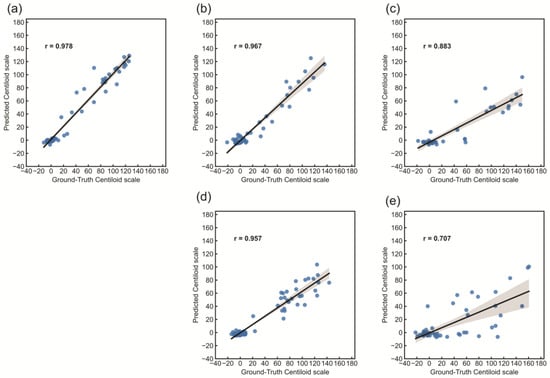 Scatter plot between the ground truth and the predicted Centiloid scale. The results of the linear regression analysis are shown with a black line, and r is the correlation coefficient: (a) 11C-PiB, (b) 18F-NAV4694, (c) 18F-florbetaben, (d) 18F-flutemetamol, and (e) 18F-florbetapir.