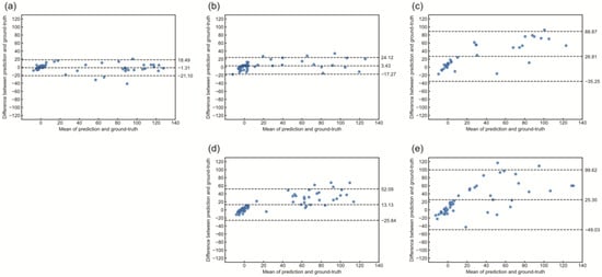 Bland-Altman plot comparing the ground truth and the predicted Centiloid scale. Blue circles represent an individual measurement. The middle-dashed line represents the mean difference, while the upper and lower dashed lines indicate the limits of agreement (mean difference ± 1.96 standard deviations): (a) 11C-PiB, (b) 18F-NAV4694, (c) 18F-florbetaben, (d) 18F-flutemetamol, and (e) 18F-florbetapir.