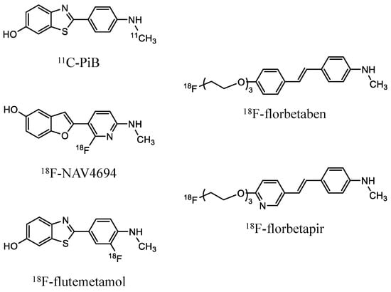 Alzheimer’s disease (AD) is a major cause of dementia characterized by amyloid-β plaques, hyperphosphorylated tau protein, and brain atrophy [,]. Amyloid-β, a key hallmark of AD, begins to accumulate over two decades before the onset of symptoms. Non-invasive amyloid positron emission tomography (PET) allows the early detection of amyloid-β accumulation, which is critical for a differential diagnosis of AD. Fluorine-18-labeled amyloid tracers, such as 18F-florbetaben, 18F-flutemetamol, and 18F-florbetapir, are currently available for routine clinical amyloid PET imaging. On the other hand, 11C-PiB and 18F-NAV4694 are available for research only. These amyloid PET tracers visualize the distribution of amyloid-β despite different chemical architectures. Confirmation of amyloid pathology by amyloid PET or cerebrospinal fluid (CSF) tests is essential for the timely administration of disease-modifying drugs [].