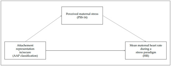 The aim of this study was to investigate the mediating effect of psychological variables, such as longitudinally perceived stress, between attachment representation and HR in mothers 12 months postpartum within a stress paradigm. Specifically, it can be hypothesized that the presentation of secure versus insecure attachment has a significant effect on maternal perceived daily stress in the past 12 months postpartum, that the presentation of secure versus insecure attachment has a significant effect on mean maternal HR under a stress paradigm, and that the relationship between the presentation of secure or insecure attachment and mean maternal HR is mediated by maternal perceived stress in the first year of the child’s life. The following model (Figure 1) was developed to be tested in the present study.