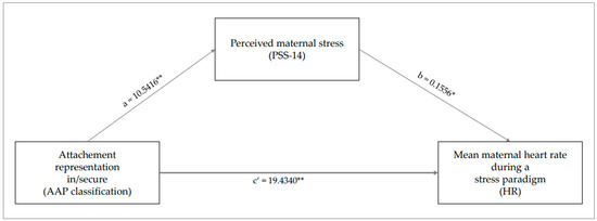 Results of the mediation of attachment representation and mean maternal heart rate through perceived stress of the mother. * The path is significant at the 0.05 level, p < 0.05. ** The path is significant at the 0.01 level, p < 0.001.