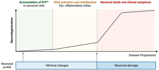 Progression of neurodegenerative disease correlated with PrPSc accumulation, glial activation, and neuronal loss. The hypothesis illustrated in this figure posits a sequential progression in prion disease initiating with a subclinical phase, during which PrPSc accumulates within neuronal cells, eliciting minimal alterations in their morphology and function [13,15]. This period is succeeded by a phase distinguished by the activation of glial cells and the development of an inflammatory environment, preceding pronounced neurodegeneration [13]. Notably, this phase may progress without overt clinical manifestations [13]. The subsequent stage is marked by accelerated neurodegeneration, culminating in significant neuronal death and the emergence of clinical symptoms [13]. Created with BioRender.com (accessed on 16 April 2024).