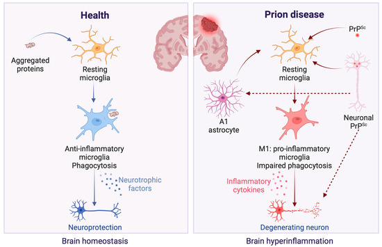 Microglial response in healthy versus prion disease conditions in the brain. In the healthy brain, microglial cells exert neuroprotective effects, as depicted on the figure’s left panel [43]. These effects are mediated through the efficient clearance of protein aggregates via phagocytosis and the secretion of neurotrophic factors, which collectively contribute to preserving neuronal structure and functionality [43]. In contrast, the presence of PrPSc in prion diseases initiates a detrimental inflammatory response, illustrated in the figure’s right panel. Neuronal PrPSc aggregates prompt microglia to adopt an M1 phenotype [11,25], fostering an inflammatory milieu detrimental to neuronal health. This state is characterized by diminished phagocytic activity and an increased release of pro-inflammatory cytokines [39], which, in turn, facilitate the conversion of astrocytes to A1 phenotype that supports further M1 microglial activation [22,24,25], exacerbating the cycle of neuroinflammation and leading to progressive neuronal damage [39]. Created with BioRender.com (accessed on 16 April 2024).