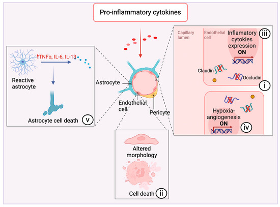 Inflammatory cytokines can disrupt BBB integrity through multiple mechanisms, including (i) modulating the expression of TJ proteins, (ii) altering the morphological properties of endothelial cells and inducing death, (iii) orchestrating the release of inflammatory cytokines, (iv) initiating the hypoxia-angiogenesis program within endothelial cells, and (v) compromising the supportive functions of astrocytes that are integral to the BBB structure (Figure 4).
