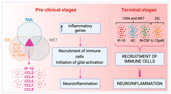 Cytokine profiles in pre-clinical and terminal stages induced by prion strains. Comparative overview of cytokine profiles at different stages of prion diseases induced by strains RML, 22L, ME7, and 139A. The Venn diagram illustrates the shared inflammatory cytokines upregulated by the RML, 22L, and ME7 strains, indicating a typical early-stage inflammatory response in the pre-clinical phase of the disease [79]. Key cytokines are highlighted within the overlapping section, which signifies the unified response across the three prion strains [79]. The 22L strain, upon further investigation, revealed an expanded spectrum of cytokines (CCL3, IL-1β, CXCL1, and IL-12p40) present in the pre-clinical stage [32,59]. This collective upregulation of inflammatory genes results in the recruitment of immune cells and initiating glial activation, setting the stage for progressive neuroinflammation. At the terminal phase of the disease, the 139A strain, evaluated solely at this stage, alongside 22L and ME7 strains, demonstrates a novel repertoire of cytokines, including IP-10, KC, M-CSF, and IL-12p40 [32], differing from those in the pre-clinical stage, and are indicative of a more advanced inflammatory state. The concentration of the cytokine 12p40 was markedly increased, exhibiting a thirty-fold elevation in the terminal stage relative to the pre-clinical stage for the 22L strain [32]. The progression to the terminal stage is characterized by increased recruitment of immune cells and exacerbated neuroinflammation. Notably, the RML strain was not evaluated at the terminal stage. Created with BioRender.com (accessed on 16 April 2024).