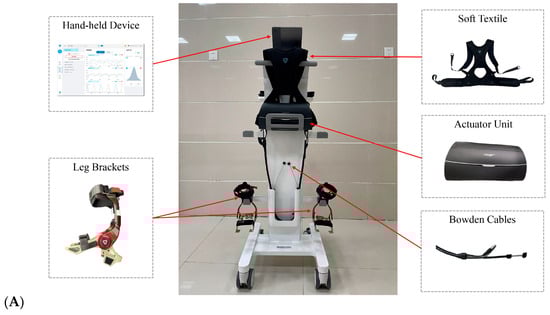 In this study, Relink-ANK (Yrobot Technology Co., Ltd., Suzhou, China), or “Relink” for short, was used. This is a commercially available SRE based on soft exosuit technology [11]. This particular SRE was chosen for its lightweight design, ease of use, and ability to provide customized assistance to the ankle joint. It consists of an actuator unit and two leg braces supplemented by associated fabrics for improved comfort and fit. The actuator unit houses two electric motors, a central processing unit (CPU), a battery, and a pulley system, and it is fastened to the user’s waist via straps. Leg brackets, designed to attach to the calf and foot, are interconnected with the actuator unit through communication and Bowden cables. These cables facilitate data transfer and motor assistance by transmitting sensor data to the CPU for real-time processing and conveying motor-generated forces to aid ankle motion.