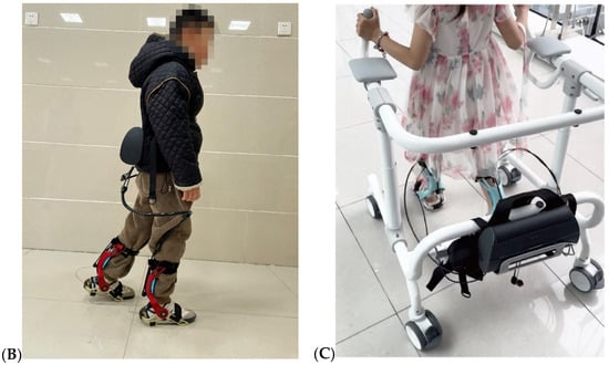 In recent years, robot-assisted gait training (RAGT) has been recognized as an effective method to improve lower limb motor function in children with SCP [8,9]. Exoskeleton rehabilitation robots commonly used in the market are usually bulky, labor-intensive to wear, and expensive [10]. With the development of soft exoskeleton technology [11], soft robotic exoskeletons (SREs) have emerged as lightweight wearable walking assistive devices. They are more affordable than traditional exoskeleton robots and have the potential to broaden their use in community and home environments. This is crucial for improving the community participation of children with SCP, especially in developing countries. In addition, the SRE assists the wearer’s natural ankle motion by providing auxiliary support to the dorsiflexors and plantarflexors [12,13]. This represents a patient-initiated training mode, where the walking process is completely controlled by the wearer, which may be more motivating for the wearer, especially for children. This assistance contrasts with most traditional exoskeleton robots, which typically dictate the wearer’s movement based on pre-programmed trajectories [14]. Unlike treadmill-based therapies, SREs are mobile and offer users a realistic and unrestricted walking experience, which is crucial for promoting functional recovery and reintegration into daily activities [15]. Studies involving healthy individuals have shown that SREs can effectively apply controlled forces, thereby enhancing the walking economy [16]. In the context of CP, a study has demonstrated significant improvement in the six-minute walk test performance among children using SREs [17]. Research involving stroke patients has also shown promising results. SREs can promptly modify gait functions, reduce the energy expenditure required for walking, and even sustain therapeutic benefits in unassisted walking after the device is removed [12,18,19]. Notably, a multicenter clinical study involving 36 stroke patients who underwent a 5-day SRE-assisted walking therapy reported improvements in their unassisted walking speed [20].