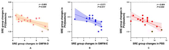 To further investigate the underlying mechanisms of SRE-induced changes in energy expenditure, additional correlation analyses were performed using linear regression to compare the relationship between SRE-induced changes in energy expenditure (PCI) and changes in the major clinical assessment scales (GMFM-D, E, PBS). The results showed a significant correlation between changes in energy expenditure and changes in GMFM-D (r = −0.665, p = 0.004), GMFM-E (r = −0.571, p = 0.017), and PBS (r = −0.664, p = 0.004), which suggests that reductions in energy expenditure are positively correlated with increases in GMFM-D, E, and PBS scores, respectively. See Figure 3.