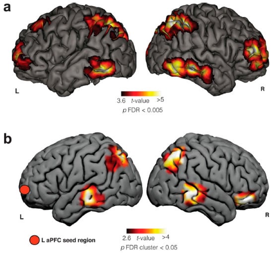 Frontal, parietal, and temporal brain areas are involved in LD, which is evidenced by two different methods of neuroimaging: (a) Blood-oxygen-level-dependent (BOLD) activity in an fMRI case report of LD. (b) Seed-based resting-state (SBRS) functional connectivity differences between frequent lucid dreamers and non-frequent lucid dreamers (control group). Adapted from [15] with permission from the authors. R = right side and L = left side. aPFC = anterior prefrontal cortex.