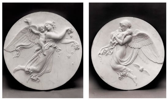 Several poppy-derived products have been used over time, such as raw opium, laudanum, laudanum tinctures, and poppy tea, among others. There are dozens of alkaloids in opium, including morphine, the most important narcotic substance of poppy. Morphine was first isolated in 1806 by Friedrich Sertürner, which demonstrated that it was the sleep-inducing narcotic substance of opium [63]. Sertürner first referred to the substance as the “principium somniferum” and later named it “morphium” after Morpheus, the Greek god of dreams. Later, the alkaloid was renamed “morphine” by Joseph Louis Gay-Lussac [63]. There are several representations of the narcotic properties of morphine and poppies in mythology. According to Greek mythology, Hypnos and Thanatos are the personifications of sleep and death and are usually associated with opium poppies [63]. A marble sculpture of Bertel Thorvaldsen of 1815 represents the Day and Night angels; Night is represented holding two children, sleep and death, and Night has her hair decorated with poppy branches [65] (Figure 4). Despite being a natural alkaloid, it is accepted nowadays that morphine is synthesized by mammalian cells from DA, although the function of endogenous morphine in the body is still a matter of debate [66].