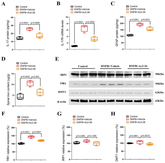 Astrocytes that are involved in neuroinflammatory process and dorsal horn synaptic plasticity in the spinal cord are one of the most important contributors to the pathogenesis of persistent pruritus [7,8,9]. Biochemical experiments were employed to quantitatively measure spinal IL-17, IL-17R, GFAP, iron content and iron metabolism-related proteins (TfR1, IRP1 and DMT1). It was detected that the spinal expressions of IL-17, IL-17R and GFAP were dramatically elevated on day 3 after DNFB intervention (p < 0.05, n = 4, Figure 2A–C). In parallel, we observed that DNFB caused a robust increase in the iron concentration and an overexpression of TfR1 (p < 0.05, n = 4, Figure 2D–F) while the IRP1 and DMT1 levels were not changed (Figure 2E,G,H). Intriguingly, pre-treatment with Ac2-26 (intrathecal, 10 μg) suppressed the up-regulation of IL-17, IL-17R and GFAP expressions following DNFB exposure (p < 0.05, n = 4, Figure 2A–C). Also, TfR1-mediated iron overload was impaired by pre-administration of Ac2-26 (p < 0.05, n = 4, Figure 2D–F). Collectively, these specific findings imply that the inhibitory effects of ANXA1 on ACD-induced chronic itch might be associated with reducing IL-17-mediated astrocyte activation and TfR1-caused iron accumulation in the dorsal horn of the spinal cord.