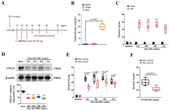 Spinal therapy with ANXA1-derived peptide Ac2-26 reduces cholestatic itch in mice. (A) Experimental design for intrathecal (i.t.) treatment with Ac2-26 in BDL-induced chronic pruritus. (B) Serum levels of total bilirubin were measured after sham and BDL surgery. n = 4 mice/group. (C) Scratching bouts after BDL surgery. n = 6 mice/group. (D) The expression of ANXA1 in the spinal dorsal horn after BDL surgery was measured. n = 4 mice/group. (E) Pre-administration of Ac2-26 prevents BDL-induced scratching behaviors. n = 6 mice/group. (F) Single injection of Ac2-26 (i.t., 10 μg) on day 21 after BDL surgery attenuates the established persistent scratching behaviors. n = 6 mice/group. All behavioral and biochemical results are expressed as medians with interquartile ranges and individual data plots. **** p < 0.0001 vs. sham group.