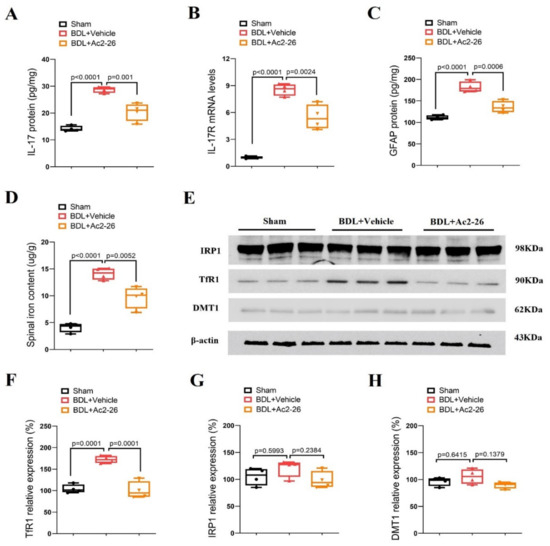 3.4. ANXA1-Derived Peptide Ac2-26 Inhibits Spinal IL-17 and IL-17RA over-Expression, Astrocyte Activation and Iron Overload in Cholestasis Mice
