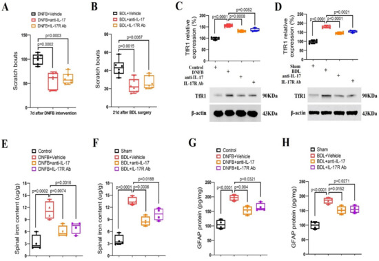 Spinal inhibition of IL-17 cascade reduces dermatitis-induced chronic itch and cholestatic itch in mice. (A) Intrathecal injection of anti-IL-17 (2 μg) and IL-17R Ab (2 μg) were performed on day 7 following DNFB intervention. The therapy with anti-IL-17 and IL-17R Ab attenuated the established persistent scratching behaviors. n = 6 mice/group. (B) Intrathecal injections of anti-IL-17 (2 μg) and IL-17R Ab (2 μg) were performed on day 21 following BDL operation. The therapy with anti-IL-17 and IL-17R Ab attenuated the established persistent scratching behaviors. n = 6 mice/group. (C–F) Spinal expression of TfR1 and iron concentration after anti-IL-17 and IL-17R Ab treatment were measured in mice with DNFB exposure and BDL surgery, respectively. n = 4 mice/group. (G,H) The expression of GFAP in the spinal dorsal horn was measured by ELISA assay. n = 4 mice/group. All behavioral and biochemical results are expressed as medians with interquartile ranges and individual data plots.