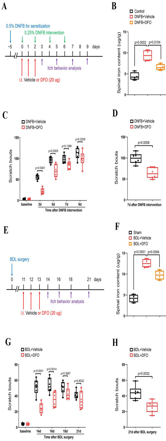 Iron chelation reduces dermatitis-induced chronic itch and cholestatic itch in mice. (A) Experimental design for intrathecal (i.t.) treatment with iron chelator DFO in DNFB-induced chronic pruritus. (B) Spinal iron concentration after DNFB and DFO treatment was measured. The dorsal horns of spinal cord were collected on day 3 following DNFB exposure. n = 4 mice/group. (C) Pre-administration of DFO prevented DNFB-induced scratching behaviors. n = 6 mice/group. (D) Single injection of DFO (i.t., 20 μg) on day 7 after DNFB exposure attenuates the established persistent scratching behaviors. n = 6 mice/group. (E) Experimental design for intrathecal (i.t.) treatment with iron chelator DFO in BDL-induced chronic pruritus. (F) Spinal iron concentration after BDL surgery and DFO treatment was measured. The dorsal horns of spinal cord were collected on day 14 following BDL surgery. n = 4 mice/group. (G) Pre-administration of DFO prevented BDL-induced scratching behaviors. n = 6 mice/group. (H) Single injection of DFO (i.t., 20 μg) on day 21 after BDL surgery attenuates the established persistent scratching behaviors. n = 6 mice/group. All behavioral and biochemical results are expressed as medians with interquartile ranges and individual data plots.