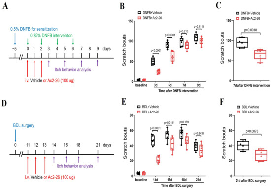 Considering the low translational value of Ac2-26 in clinical patients because of its delivery methods (intrathecal injection) to mice, we finally explored whether systemic Ac2-26 (intravenous, 100 μg) treatment is effective against chronic pruritus syndrome (Figure 7A–F). Interestingly, intravenous pre-administrations of Ac2-26 prevented DNFB-induced persistent scratching behaviors (F (1, 50) = 43.74, p < 0.0001, n = 6, two-way ANOVA, Figure 7A,B) and BDL-induced scratching phenotypes (F (1, 50) = 36.62, p < 0.0001, n = 6, two-way ANOVA, Figure 7D,E). Meanwhile, a single injection of Ac2-26 following the intravenous route ameliorated the existing DNFB-induced itch-like activities (p = 0.0018, two-tailed Student’s t test, Figure 7C) and BDL-induced spontaneous scratching bouts (p = 0.0078, two-tailed Student’s t test, Figure 7F)