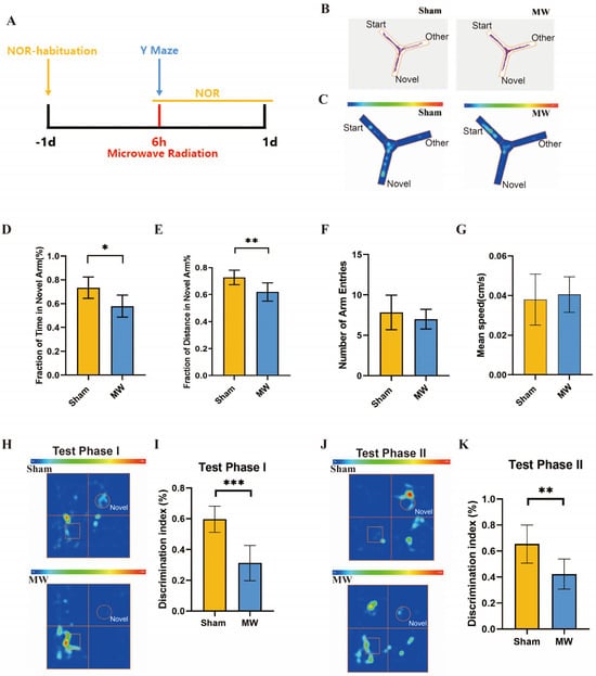 Firstly, we assessed the effects of microwave radiation on memory and spatial exploration abilities using behavioral experiments (Figure 2A). The Y maze is a method designed to assess spatial memory and exploratory ability in rodents, which is strongly correlated with hippocampus (HPC) synaptic plasticity [21,24]. Y-maze results (Figure 2B,C) revealed that compared to the Sham group, rats in the MW group had a significant decrease in the total time spent exploring the novel arm (Figure 2D) and a significantly shortened total distance traveled in the novel arm (Figure 2E). There were no differences in the number of entries into the novel arm and average movement speed between groups (Figure 2F,G). In addition, we performed the NOR test to assess the learning and recognition memory of rats [25]. The heat map of the rats’ movement trajectory showed a decrease in the exploration frequency of new objects after microwave radiation (Figure 2H,J). We found that DI of rats in Test Phase I and Test Phase II significantly declined after microwave radiation (Figure 2I,K). These results indicate a decline in rat spatial memory, recognition memory, and spatial exploration abilities caused by microwave radiation.