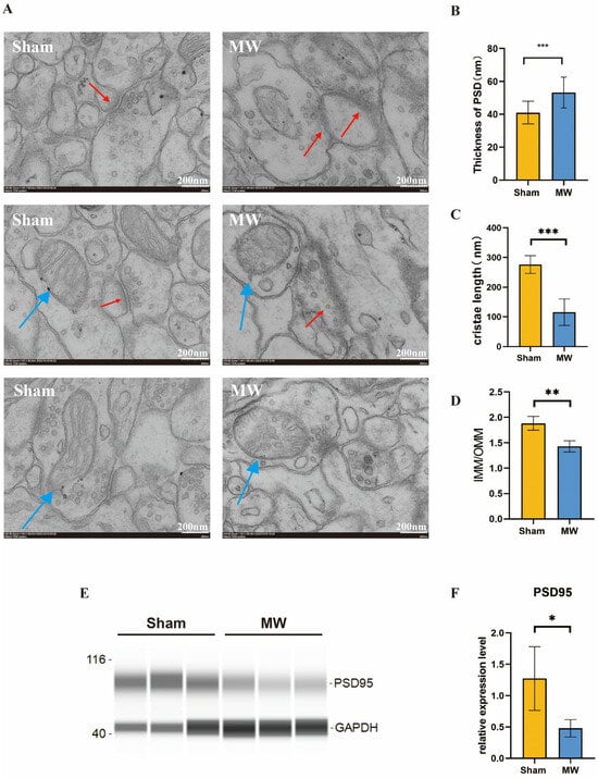To further understand the changes in the ultrastructure of hippocampal neurons after microwave radiation, we observed the synaptic structure and neuronal mitochondria of the rat hippocampus through electron microscopy. We found that the synaptic clefts were blurred, the postsynaptic densities thickened, and the mitochondria exhibited fragmentation and vacuolization. (Figure 3A). Quantitative results showed that compared to the Sham group, the MW group exhibited a significant increase in postsynaptic densities (Figure 3B). In addition, Western blot was performed to assess the level of PSD95, which is a synaptic-associated protein [26]. The protein level was reduced in the MW group (Figure 3E,F), indicating damage to the synaptic plasticity of hippocampal neurons in rats [27]. The mitochondrial cristae length significantly decreased (Figure 3C), and the ratio of the inner mitochondrial membrane to the outer mitochondrial membrane (IMM/OMM) notably reduced in hippocampal neurons after microwave radiation (Figure 3D). These findings indicate that microwave radiation induces ultrastructural damage to hippocampal neurons in rats by disrupting synaptic and mitochondrial structures.