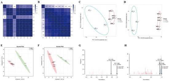 In the correlation heat maps of quality control (QC) samples (Figure 4A,B), the correlation coefficient between QC samples was ≥0.951, indicating that the types and abundance of metabolites in QC samples were within the range of random errors. Typically, a correlation coefficient > 0.75 between QC samples is considered indicative of reliable data quality. Principal component analysis (PCA) revealed good intra-group clustering and distinct inter-group differences in both negative and positive ion modes (Figure 4C,D). Partial least-squares discriminant analysis (PLS-DA) of the metabolites between the two groups and the control group showed clear separation and significant differences in both negative and positive ion modes (Figure 4E,F). Orthogonal partial least-squares discriminant analysis (OPLS-DA) indicated excellent model fitting (R2Y = 0.996 in negative ion mode, R2Y = 0.999 in positive ion mode) and predictive ability (Q2 = 0.769 in negative ion mode, Q2 = 0.91 in positive ion mode) (Figure 4G,H), suggesting robust model performance (R2Y ≈ 1) and predictive capability (Q2 ≥ 0.4).