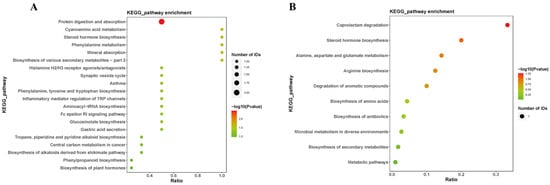 Annotation of the differential metabolites was conducted using the Kyoto Encyclopedia of Genes and Genomes (KEGG) for pathway analysis (Figure 6). The results revealed that the metabolic pathways primarily affected by differential metabolites include cholesterol sulfate and tetrahydrocortisol involved in the steroid hormone biosynthesis. L-phenylalanine participates in the phenylalanine, tyrosine, and tryptophan biosynthesis, as well as the phenylalanine metabolism. Histamine was associated with the neuroactive ligand–receptor interaction, as well as the inflammatory mediator regulation of transient receptor potential (TRP) channels. These findings suggest that microwave radiation may induce neuroinflammation, hinder neurotransmitter synthesis, and disrupt steroid hormone biosynthesis, thereby affecting the structure of hippocampal tissues and related learning and memory functions in microwave-exposed rats.