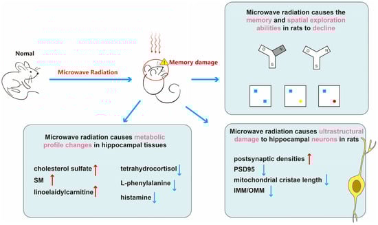 In summary (Figure 7), microwave radiation results in decreased learning and spatial exploration abilities in rats, structural damage to hippocampal neurons, and disruption of hippocampal tissue metabolism. Among them, cholesterol sulfate, sphingomyelin, linoelaidylcarnitine, tetrahydrocortisol, L-phenylalanine, and histamine may be sensitive metabolites for learning and memory impairment. More than half of the metabolites belong to lipids and lipid-like molecules. The content of adipose tissue in brain is second only to adipose tissue, making brain function highly sensitive to disturbances in lipid metabolism [45]. Research has shown that gene expression in adipose tissue is associated with cognitive domains, contributing to the formation of neurons and synapses [46]. Moreover, disturbances in lipid metabolism may also impact inflammatory responses and oxidative stress, thereby exacerbating cognitive decline. Dysregulation of brain lipid metabolism is implicated in the decline of cognitive function and the progression of neurodegenerative diseases, such as the generation of amyloid-beta in Alzheimer’s disease [47]. We believe that disruptions in lipid metabolism are a crucial mechanism underlying microwave radiation-induced learning and memory impairments.