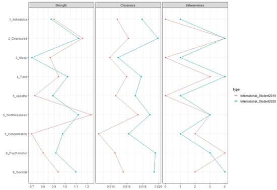 We then used network analysis to compare the PHQ-9 scores between domestic and international students for each year. Figure 1 shows the comparison of network centrality between 2019 and 2020 for international students. Strength centrality indicates how strongly a node is connected to other nodes in the network. Closeness centrality is the average distance from a node to all other nodes in the network. Betweenness centrality is the number of times a node is on the shortest path between two other nodes [23,24,25]. The top three items with the largest increase in terms of strength were concentration problems, appetite changes, and suicidal thoughts. The bottom three items in descending order were sleep difficulties, feelings of worthlessness, and depressed mood, which actually decreased for international students in 2020. For closeness, the top three items with the largest increase were psychomotor agitation/retardation, suicidal thoughts, and concentration problems. The bottom three items in descending order were feeling tired, feelings of worthlessness, and sleep difficulties. For betweenness, the top three items with the largest increase were suicidal thoughts, anhedonia, and sleep difficulties. The bottom three items in descending order were feelings of worthlessness, concentration problems, and psychomotor agitation/retardation, with decreases observed in 2020 for items 7 and 8.